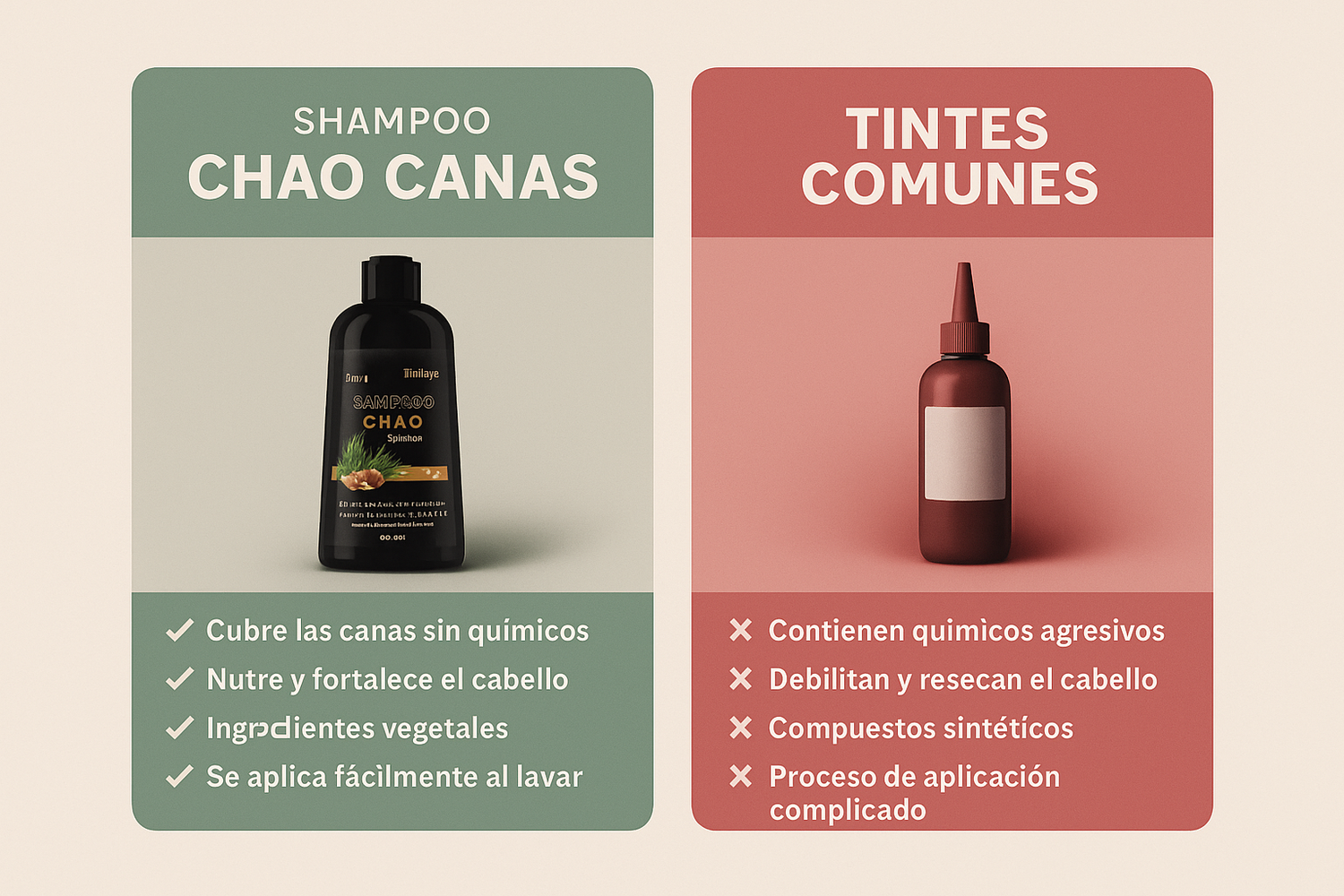 "La mayoría de productos para cubrir canas usan químicos agresivos. Lo que me gusta del Shampoo Chao Canas es que actúa de forma natural, fortaleciendo el cabello y devolviendo su color sin maltratar el cuero cabelludo."